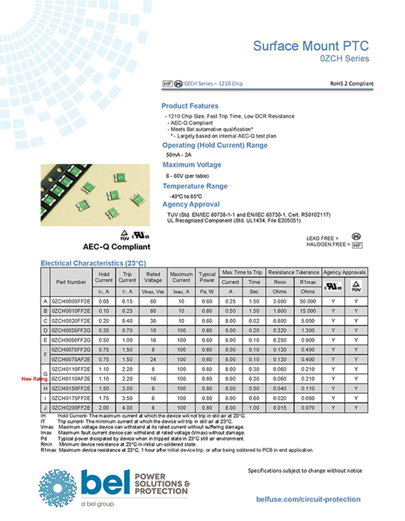 1、額定電壓范圍–6–60 VDC 2、I HOLD Amp范圍–50mA至3A 3、外殼尺寸0603至2920 4、紅外處理-JEDEC J-Std-020–260C,40秒,最長。 5、安全機構批準——UL、TUV6、工作溫度:-40°C至+85°C