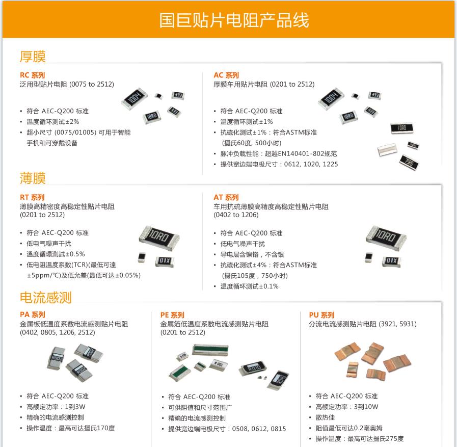 國巨貼片電阻:車用貼片電阻,電流感測微歐姆電阻,抗硫化貼片電阻,薄膜精密電阻,厚膜精密電阻,一般厚膜電阻,排阻與網絡排阻,高壓電阻